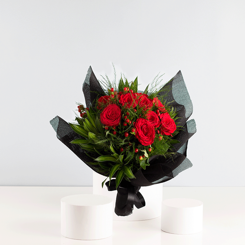 This Arrangement made of 25 red roses , 8 jamaica , 5 hybercom