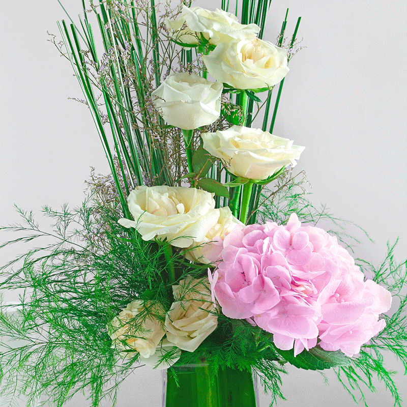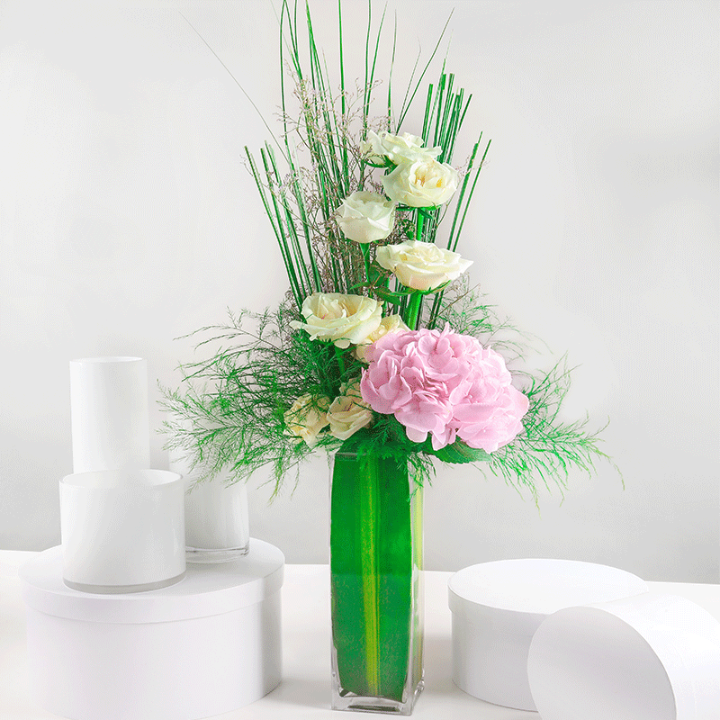 تحتوي هذه الباقة على 8 وردات جوري ابيض و 1 هيدرانجا زهري و خضار داخل فازة