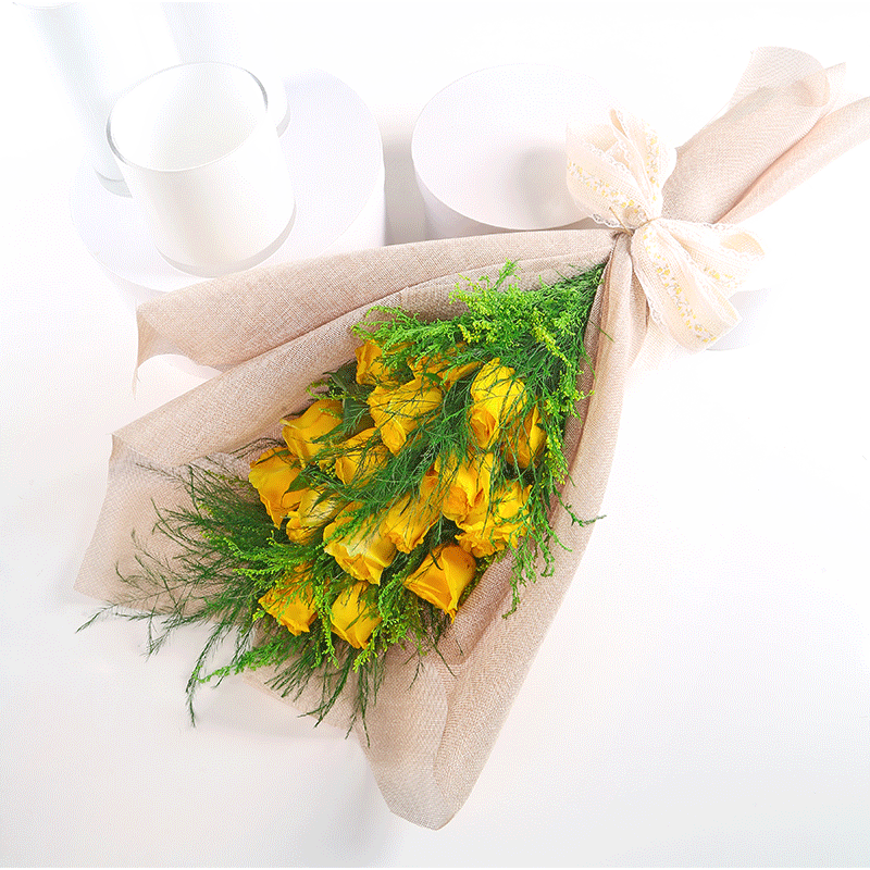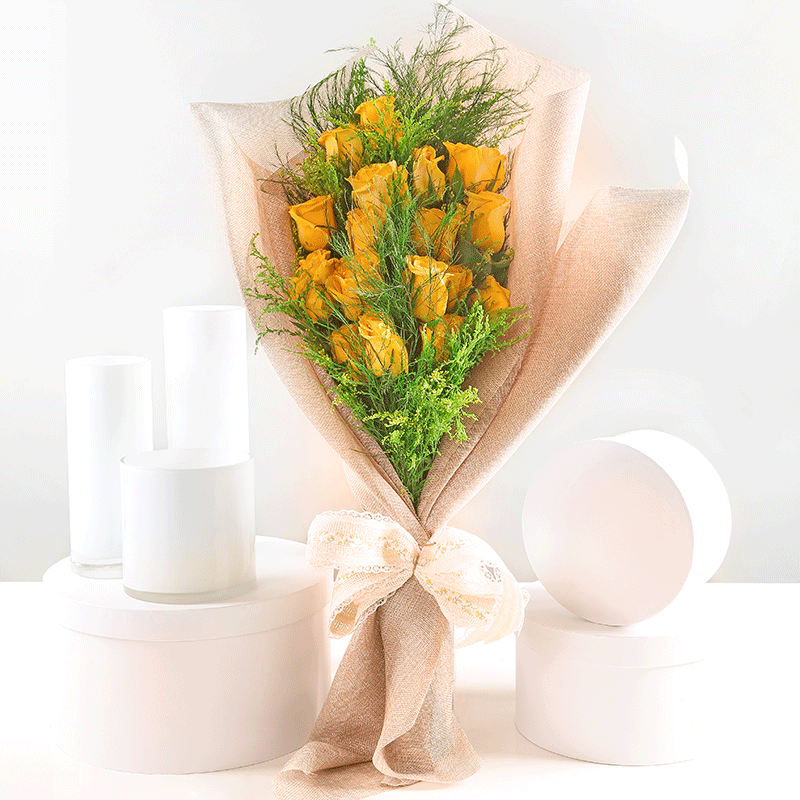 تحتوي هذه الباقة على 15 ورد جوري اصفر وخضار
