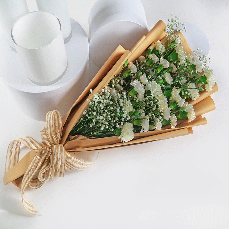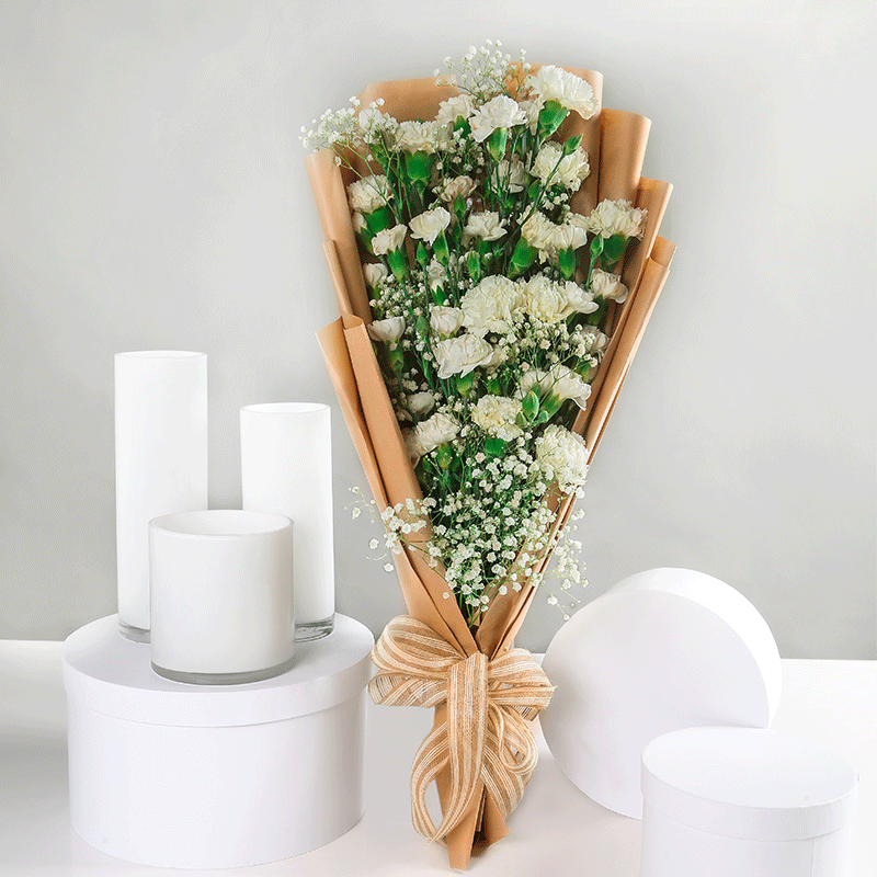تحتوي هذه الباقة على 8 قرنفل ابيض و 6 بيبي قرنفل و جبسوفيليا