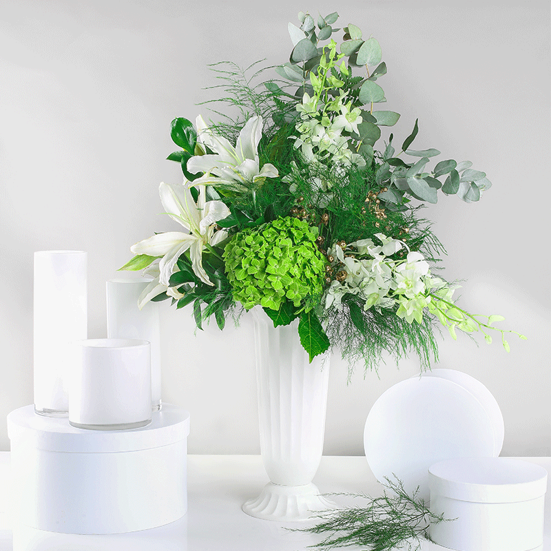 تحتوي هذه الباقة على 4 بيبي اوركيد ابيض و 2 ليليوم ابيض و 1 هيدرنجا و خضار داخل فازة