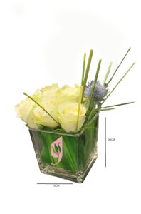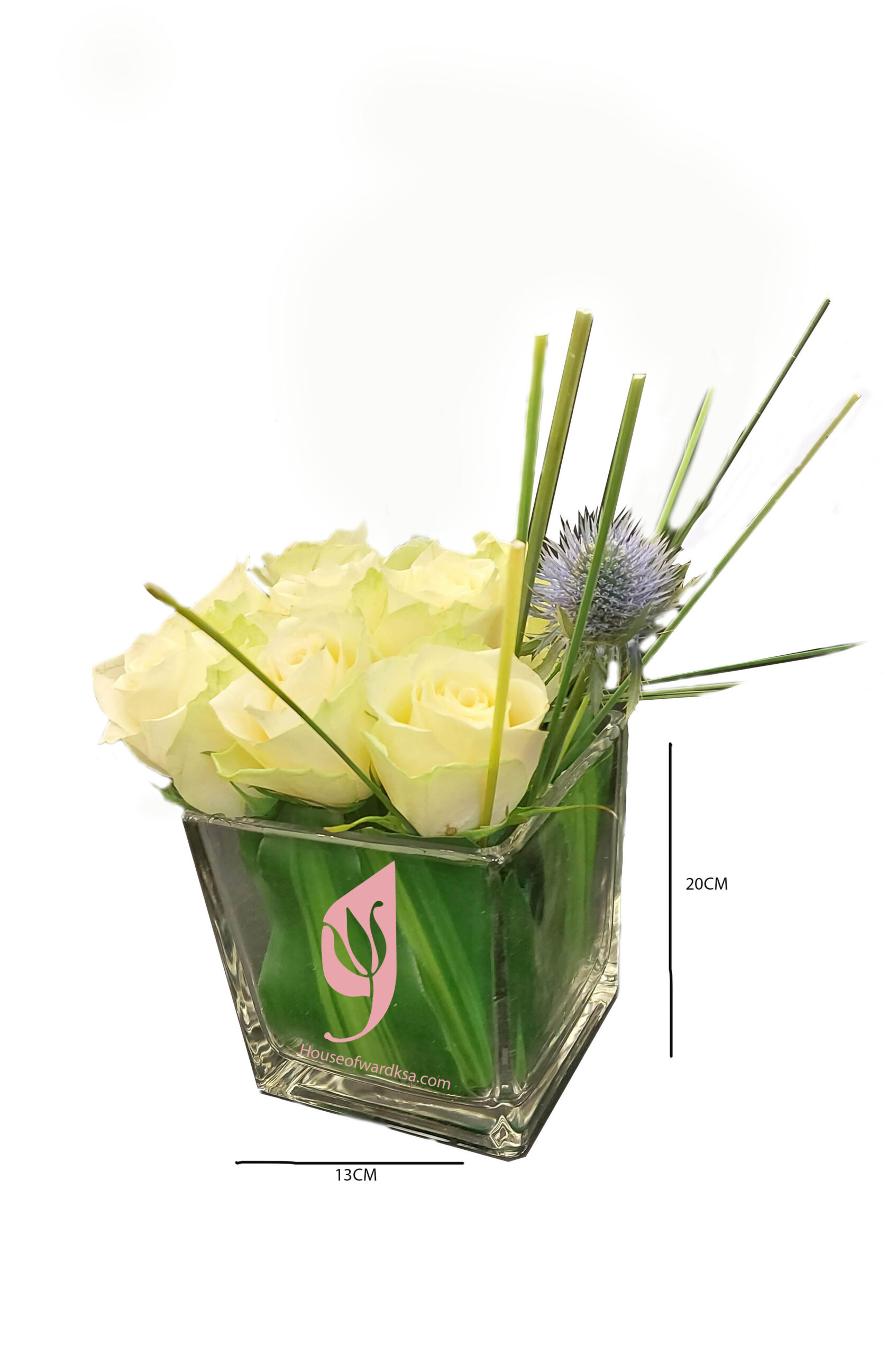 فازة زجاج شفاف مربع بالاضافة ورد جوري 9 وردات بالاضافة للاكسسوارات لون الجوري حسب الطلب تستخدم لجميع المناسبات